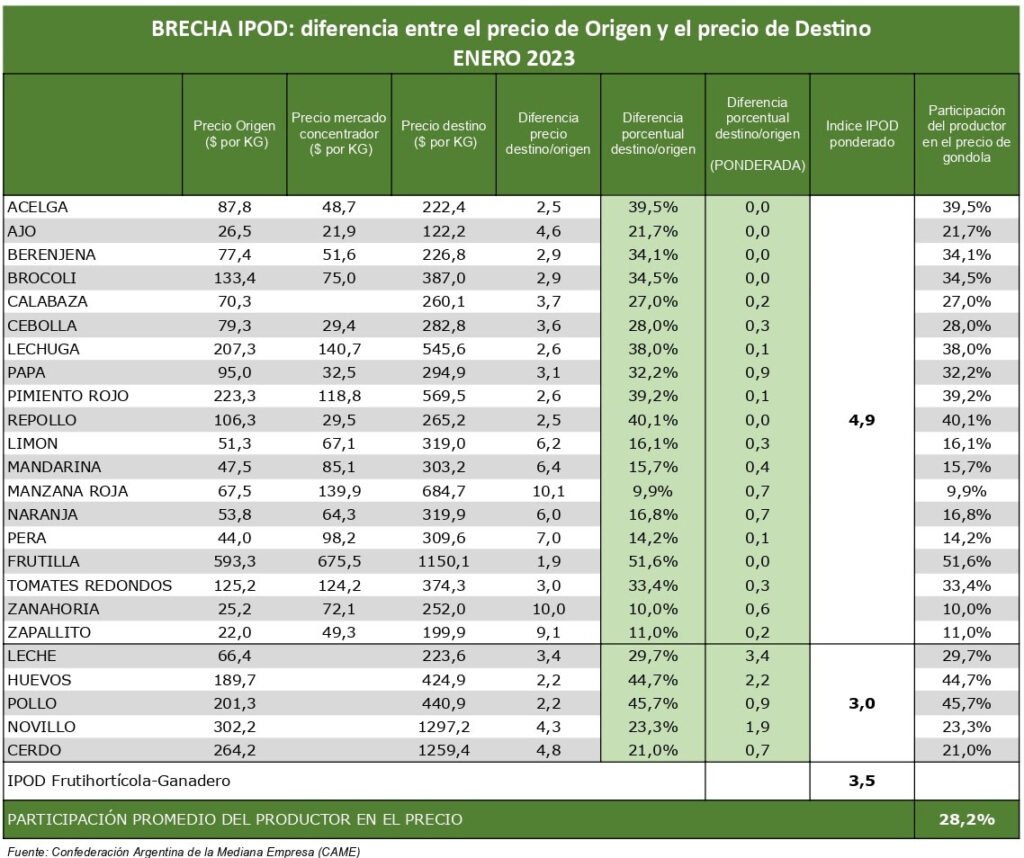 Según el Índice de Precios en Origen y Destino (IPOD) elaborado por el sector de Economías Regionales de la Confederación Argentina de la Mediana Empresa (CAME), durante enero los precios de los agroalimentos se incrementaron 3,5 veces desde el campo (origen) a la góndola (destino). Este dato representa un leve incremento respecto de la brecha de 3,4 veces de diciembre 2022.