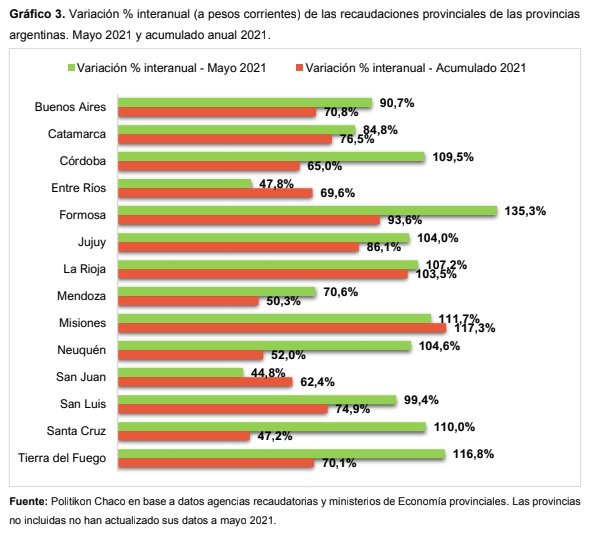 Este comportamiento inédito  de la recaudación misionera tiene un correlato en una mayor “autonomía” fiscal: en mayo de 2018, la recaudación provincial equivalía al 35% de las transferencias automáticas  de recursos de origen nacional que recibió ese mismo mes la provincia; en mayo de  2019, fue del 30,2%; en mayo de 2020 de 44,9%, y finalmente, en mayo 2021, ya  equivale al 57,4%. En este punto, es la provincia con la mayor autonomía fiscal de todo  el NEA y del norte grande.