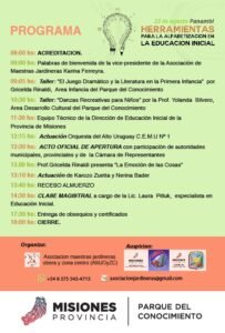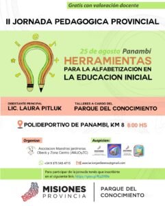 El Parque del Conocimiento participará del desarrollo y contenidos de la II Jornada Pedagógica Provincial, sobre “Herramientas para la Alfabetización en la Educación Inicial”, que se llevará a cabo el próximo viernes 25 de agosto, en el polideportivo de la localidad de Panambí. La jornada está organizada por la Asociación de Maestras Jardineras de Oberá y Zona Centro (AMJOyZC).