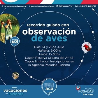 Ariel Kremar, referente de la Agencia Posadas Turismo, informó que el recorrido guiado con observación de aves se realizará los días 14 y 21 de julio a las 9 y 15:30 en la Reserva Urbana del Arroyo Itá, sobre Tomás Guido y Costanera. Los interesados deberán concurrir directamente al lugar en el día y hora de los paseos o inscribirse en la Agencia de Turismo en el Cuarto tramo de la Costanera.
