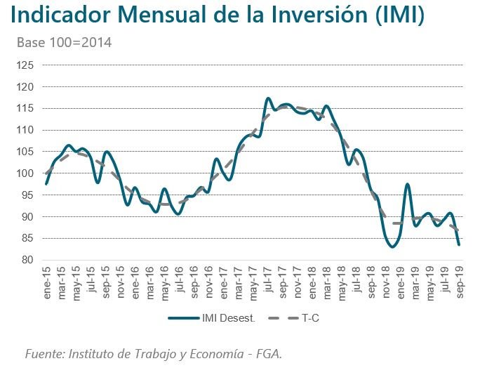 En septiembre, el Indicador Mensual de la Inversión (IMI) registró una caída de -10,8% anual. En términos desestacionalizados, presentó un descenso de -7,8% mensual. Después del estancamiento de la inversión iniciado a principios de año, a partir de julio la inversión perforo hacia la baja nuevamente su piso.