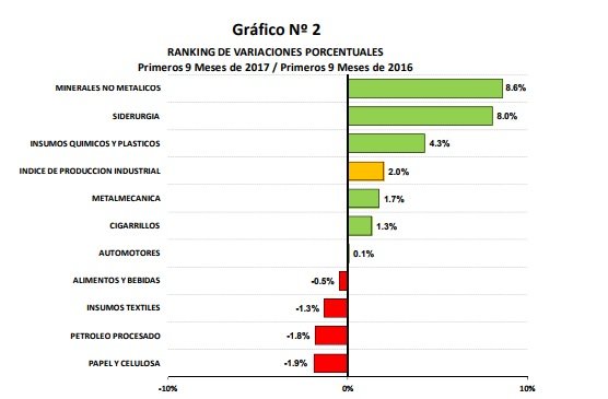 En el mes de septiembre, todas las ramas de actividad mostraron una mejora interanual de la producción, con excepción de la industria metalmecánica y la refinación de petróleo. En el mes se destacó el avance de la siderurgia y de los insumos químicos y plásticos. En el acumulado para los primeros nueve meses del año y en la comparación interanual, la producción de Minerales no Metálicos (8.6%) lidera el ranking sectorial de crecimiento, seguida de la producción siderúrgica (8.0%) y el sector de Químicos y Plásticos (4.3%).