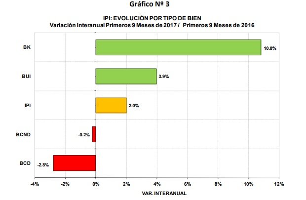 Siguiendo el desempeño sectorial y tomando en cuenta la clasificación de la actividad industrial por tipo de bienes, en el tercer trimestre y en la comparación interanual se registra crecimiento en todos los bloques, incluyendo el avance en la producción de bienes de consumo. Para los primeros nueve meses, la producción de bienes de capital continúa liderando el ranking de crecimiento, acumulando un avance de 10.8%, seguida de la producción de Bienes de Uso Intermedio que acelera su dinámica de crecimiento acumulando en nueve meses un avance interanual de 3.9%. Por su parte, los Bienes de Consumo no durables han reducido su caída a 0.2%, mientras que en el de no durables alcanza a 2.8%, en el primer nonestre y en la comparación interanual. (Gráfico Nº 3).
