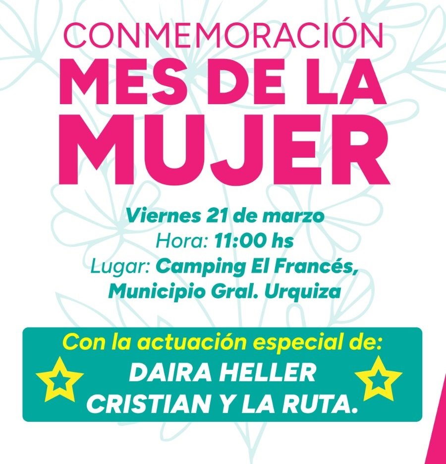 El Ministerio de Desarrollo Social, la Mujer y la Juventud, a través de la Subsecretaría de la Mujer y la Familia, realizará un encuentro en conmemoración del Día y el Mes de la Mujer #8M. El evento, que se llevará a cabo de forma conjunta con la Municipalidad de General Urquiza, tendrá lugar el próximo viernes 21 de marzo, a las 11 de la mañana en el camping “El Francés”, de la localidad.