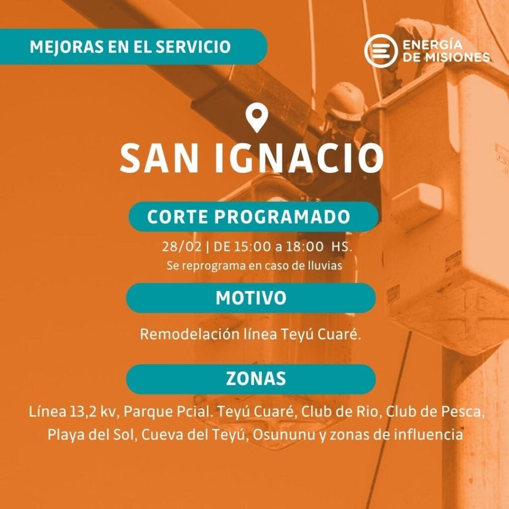 Energía de Misiones informa que el día viernes 28 de febrero se realizará un corte programado en Posadas, en el horario de 7:00 a 7:30 hs, con el fin de llevar a cabo el cambio de una cuchilla de media tensión.