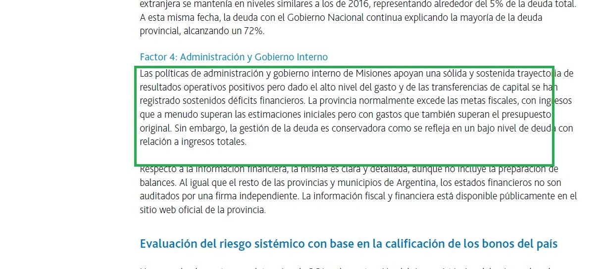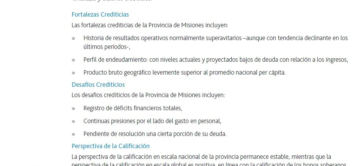 En general, el reporte de Moody’s destaca varias fortalezas de la provincia respecto a otras jurisdicciones. Es por eso que en el reporte, Moody’s le ratifica la calificación crediticia a Misiones, que es de Baa3 con la perspectiva de “Estable”.