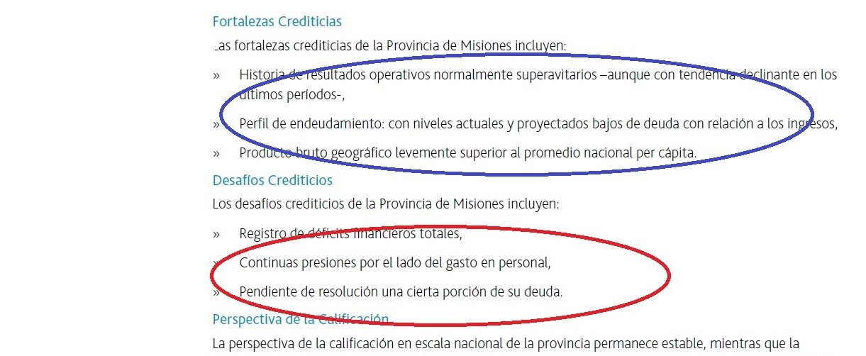 Entre otras fortalezas que destaca la calificadora de las cuentas fiscales de Misiones, están: