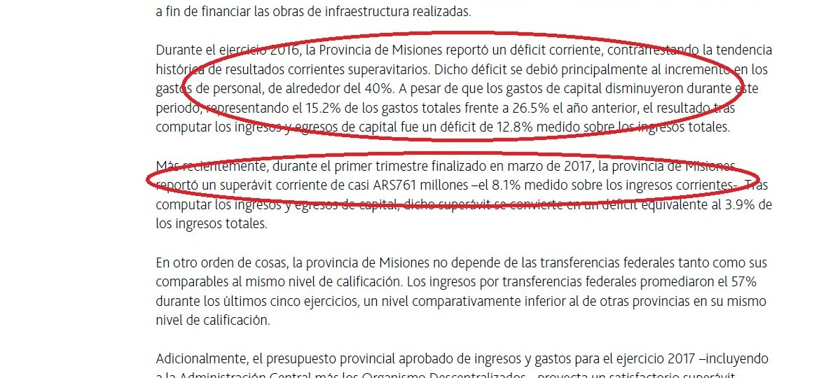 En un informe sobre la provincia aprobado el viernes pasado al que accedió en exclusiva Economis, la agencia Moody’s vaticina que Misiones volverá al superávit operativo en el 2017, tras incurrir momentáneamente en déficit en el año 2016 producto de las mayores erogaciones que significaron los gastos en personal.