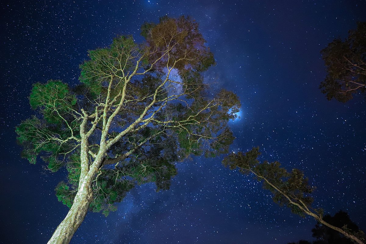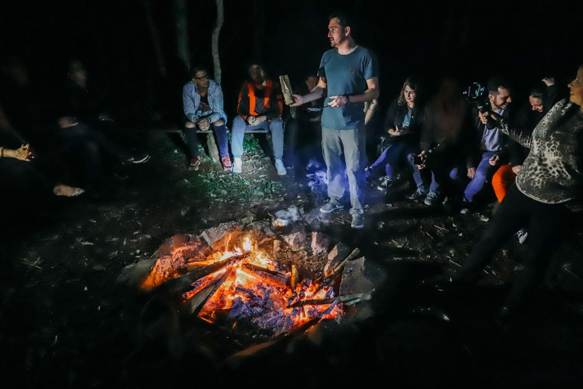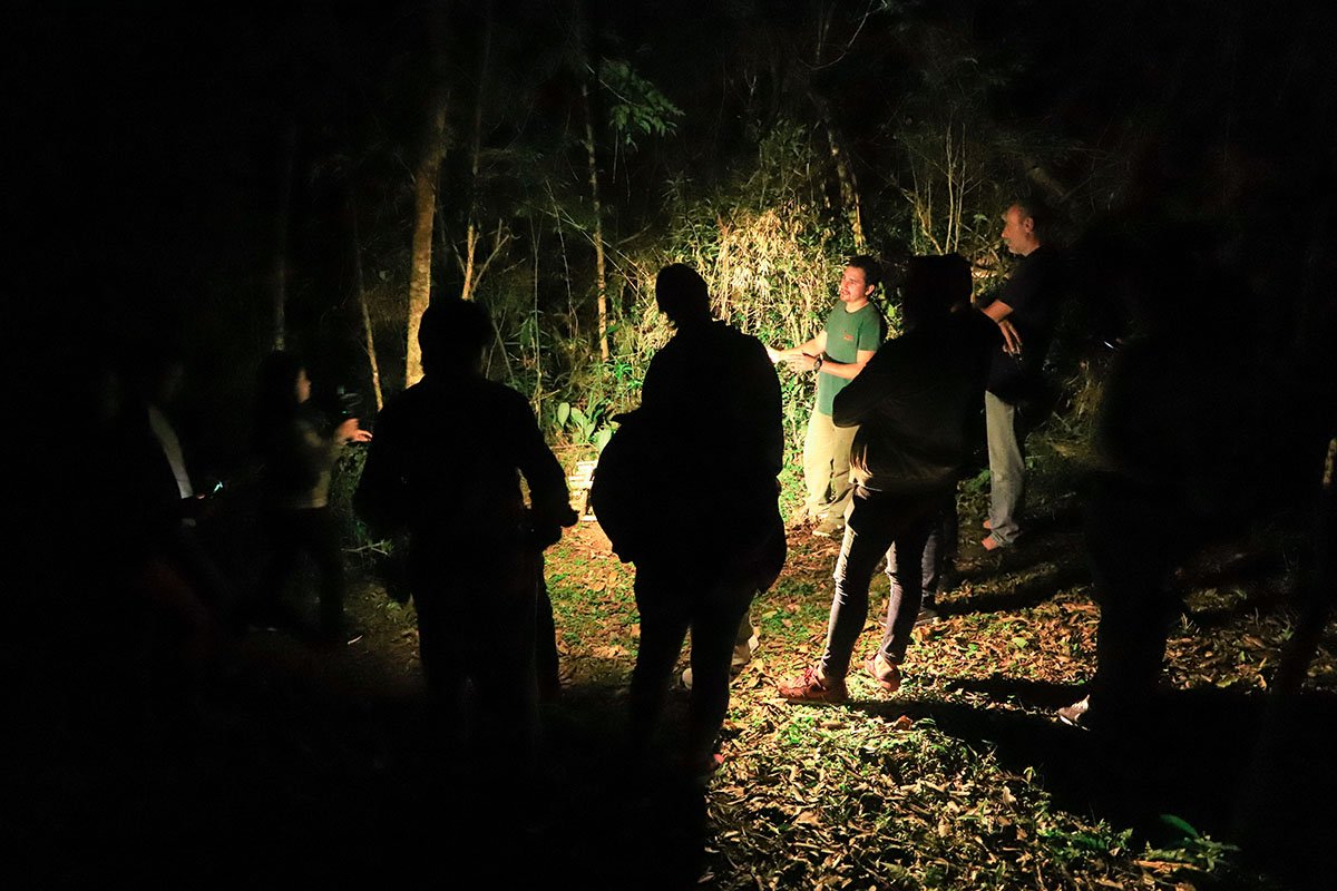 El fuego rompe la noche apenas iluminada por el brillo de las estrellas que se aprecian como nunca en la ciudad. La selva es negrura apenas llega el atardecer. Internarse en ella, en la noche es una aventura, pero los guías conocedores, acompañan y dan seguridad al turista que quiere vivir la experiencia. Al fogón se cocina un ticueí a la vieja usanza, apenas con la grasa de la carne. Al lado, espera un generoso reviro, regado con un mate cocido hecho como lo hacían los guaraníes: con un tizón quemando el azúcar y la yerba, lo que muta en un intenso aroma dulzón que se mezcla con los aromas propios del monte misionero.