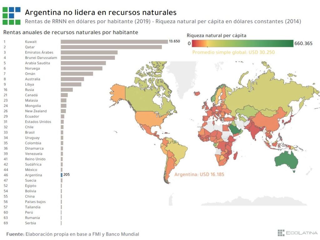 Una primera pregunta al respecto es si podemos prescindir de la manufactura y vivir de los recursos naturales. Sin embargo, una indagación más exhaustiva nos dice que esto no es posible: a pesar de contar con diversos climas, una importante superficie fértil para el cultivo, reservas de agua, petróleo y minerales, Argentina se ubica en el puesto 47 de riqueza natural per cápita sobre un total de 141 países, según las estimaciones del Banco Mundial. La distancia con quienes que encabezan dicho ranking es abismal: Qatar tienen 40 veces más capital natural por habitante que nosotros, y hay otros diez países que nos cuadruplican. Esto nos brinda una idea de la magnitud de la brecha en disponibilidad de recursos. Incluso, poseemos 71% menos riqueza natural que Chile y 56% menos que Brasil, países comparables de la región. Si en lugar del stock observamos las rentas por habitante que los países obtienen de sus recursos naturales (el flujo anual de dólares generado por los mismos), nos encontramos en el puesto número 46 de 182. Nuevamente “de mitad de tabla para arriba”, pero lejos del podio.