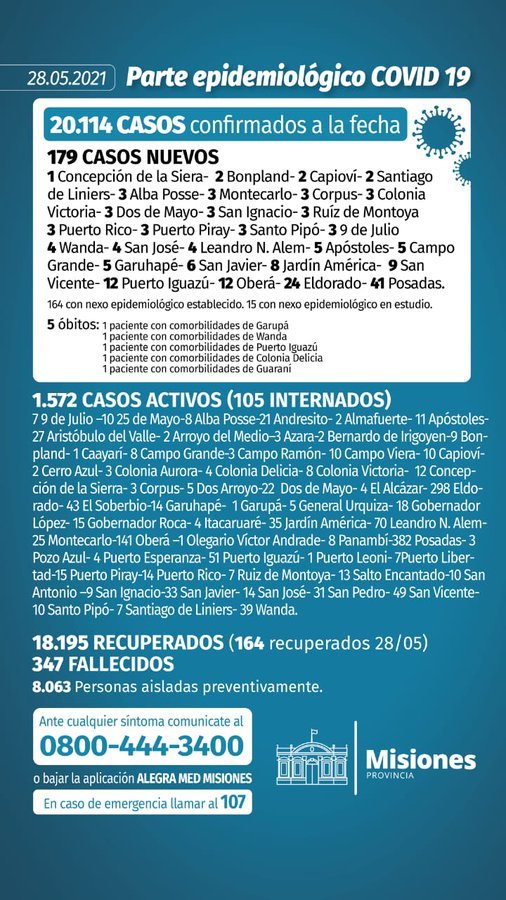 El parte oficial del Ministerio de Salud de la provincia del viernes (28/05) reveló 179 contagios y el fallecimiento de 5 personas con Covid-19. Así Misiones acumula 20.114 contagios y 347 fallecimientos desde el inicio de la pandemia.