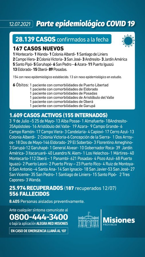 El parte oficial del Ministerio de Salud del lunes (12/07) reveló 167 contagios nuevos y el fallecimiento de seis personas con Covid-19. De esta forma Misiones acumula 28.139 contagios y 556 muertos desde el inicio de la pandemia.