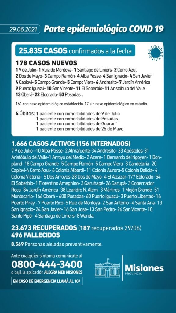El parte oficial del Ministerio de Salud Pública del martes (29/06) reveló 178 contagios nuevos y el fallecimiento de cuatro personas. Así Misiones acumula 25.835 contagios y la muerte de 496 personas desde el inicio de la pandemia
