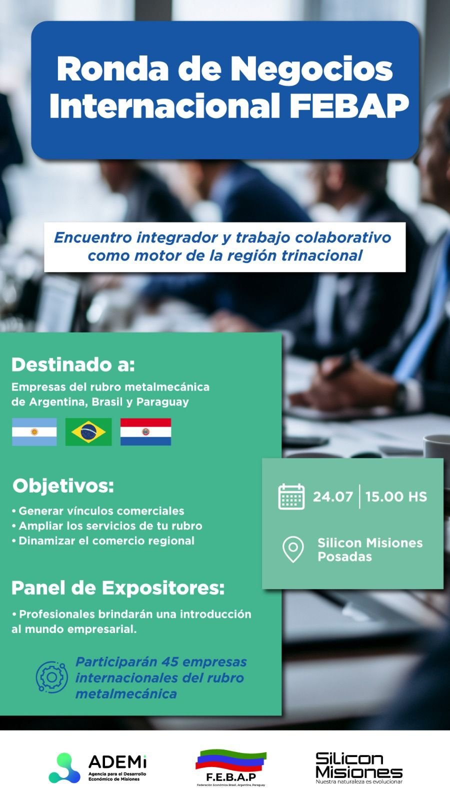 La Agencia para el Desarrollo Económico de Misiones (ADEMI) confirmó que el próximo 24 de julio, a las 15 horas, se llevará a cabo la Ronda Internacional de Negocios de la Federación Económica Brasil, Argentina y Paraguay (FEBAP) en Silicon Misiones, ubicado frente al Centro del Conocimiento, en Posadas.