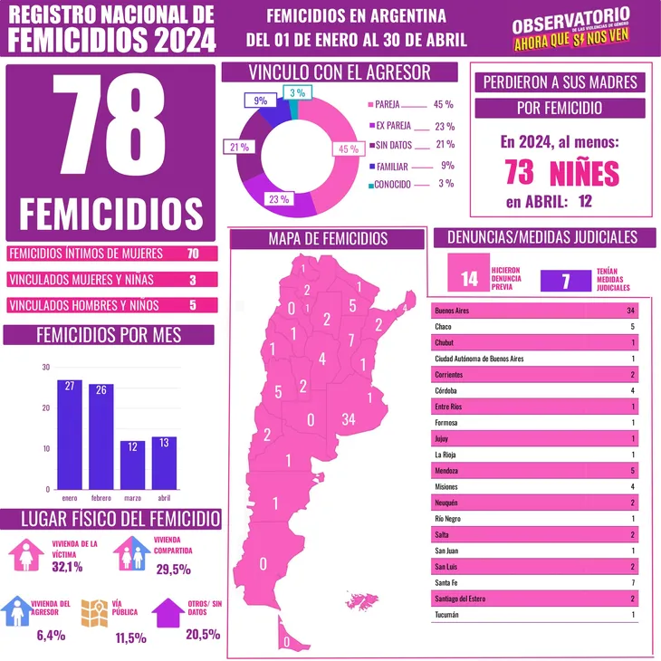 El observatorio “Ahora que sí nos ven”, que estimó un caso de femicidio cada 37 horas, indicó que en el mes de enero ocurrieron 27 casos, en febrero 26, en marzo 12 y en abril 13. Estos asesinatos provocaron que 73 menores de edad se queden sin madre.