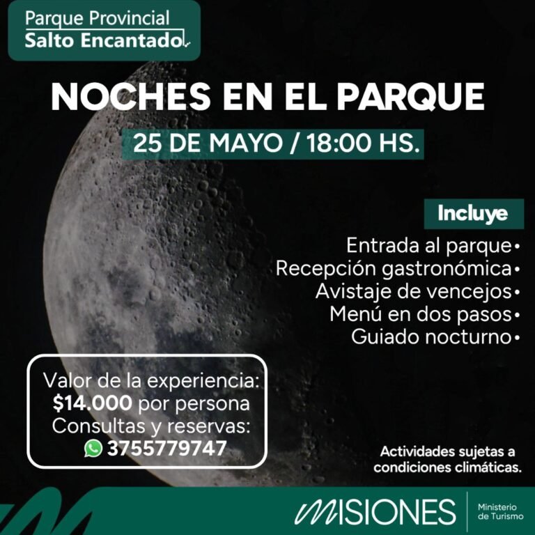 Este sábado 25 de mayo, a las 18 hs.,bajo el nombre “Noches en el parque”, el Parque Salto Encantado ofrece una propuesta nocturna con gastronomía, paseos guiados, avistajes, entre otras actividades. La iniciativa, apta para mayores de 10 años, invita a vivir la experiencia de escuchar sonidos y sentir aromas nocturnos, ingresando al predio antes de que caiga el sol hasta antes de la medianoche.