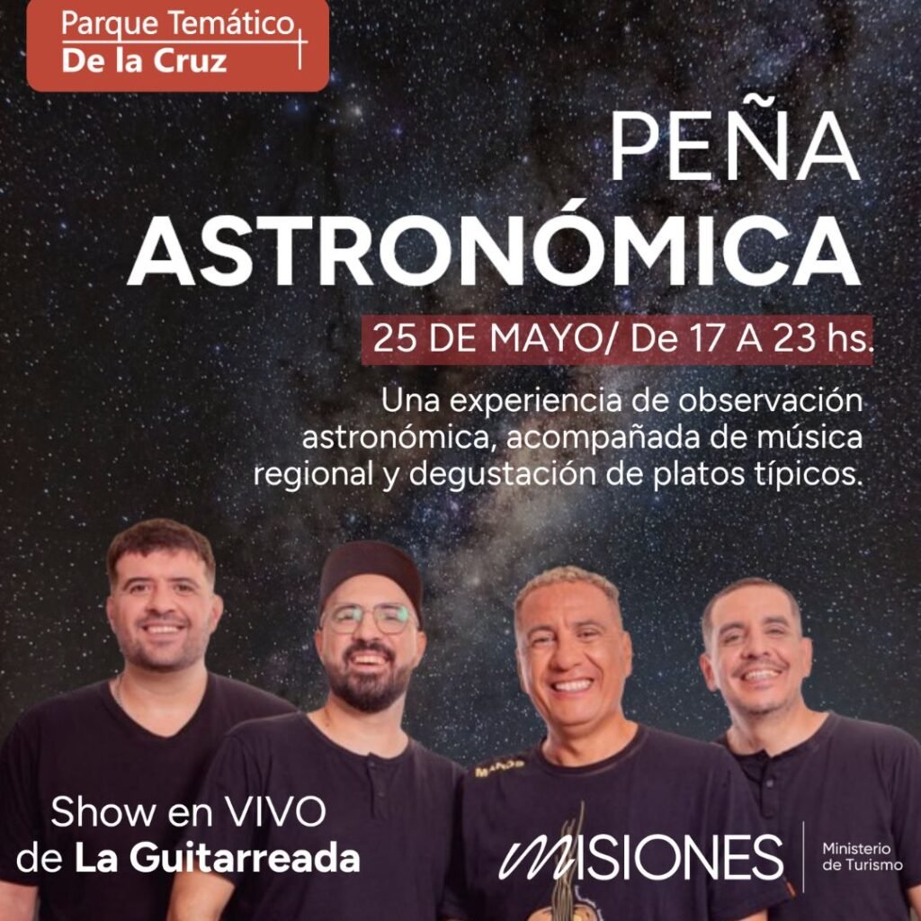 Por otro lado, ese mismo día, y en el marco de las celebraciones por la Revolución de Mayo, de 17 a 23 hs, se realizará una “Peña Astronómica” en el Parque Temático de la Cruz, ubicado en Santa Ana.
