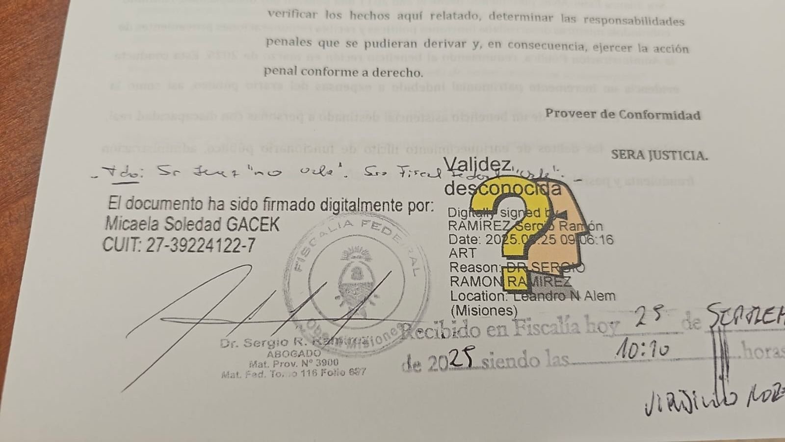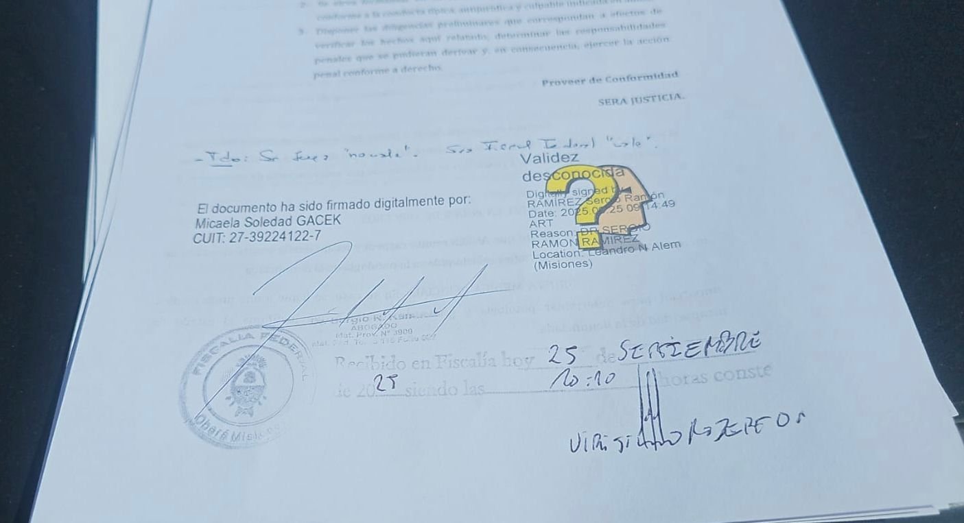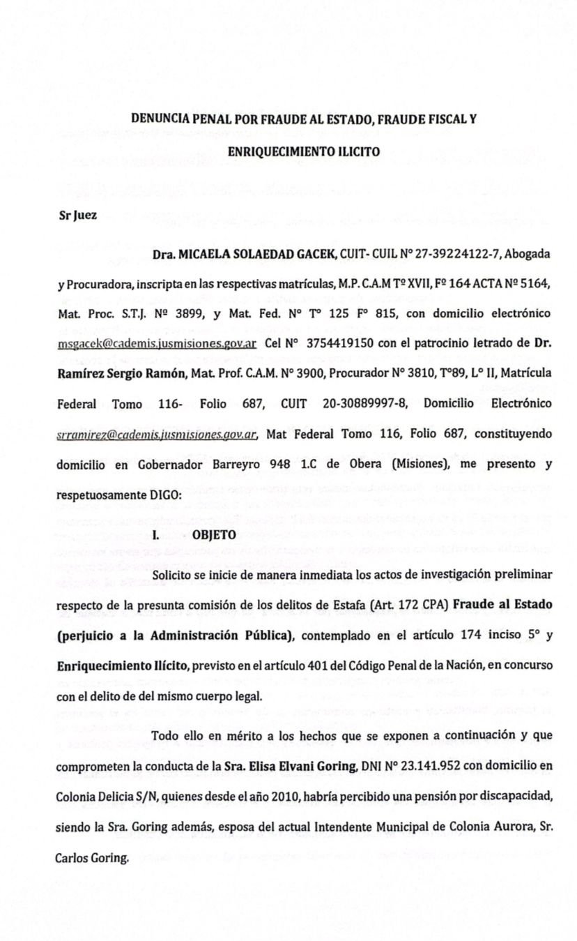 Además de la denuncia penal, Gacek pidió al Concejo Deliberante de Colonia Aurora que exija explicaciones al intendente Goring sobre el acceso a las pensiones por parte de su entorno familiar. También solicitó a la Agencia Nacional de Acceso a la Información Pública el listado de beneficiarios de pensiones no contributivas por invalidez en Misiones, con el objetivo de detectar posibles irregularidades o intermediaciones políticas.