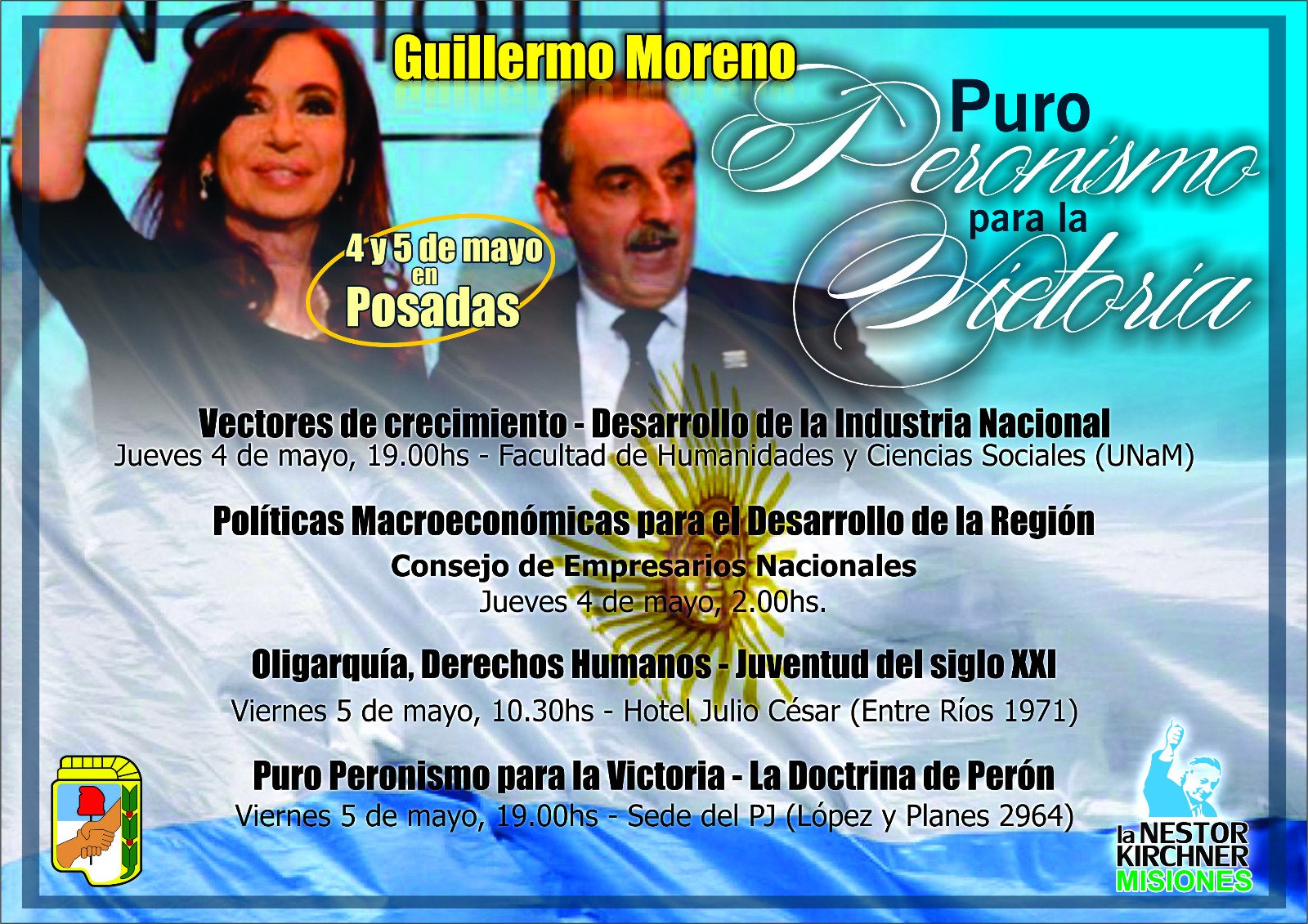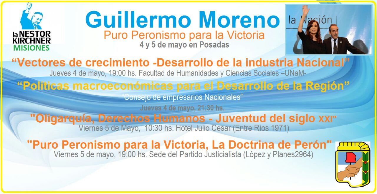 Además, el día viernes, seguirá con su agenda explicando sobre “Oligarquía, Derechos Humanos y la juventud del siglo XXI” a las 10,30 horas en el hotel Julio Cesar. Como cierre de su visita a Posadas, por la tarde desde las 19 se reunirá en la sede del PJ (López y PLanes 2964), para hablar de “Puro Peronismo para la Victoria- La Doctrina de Perón”.