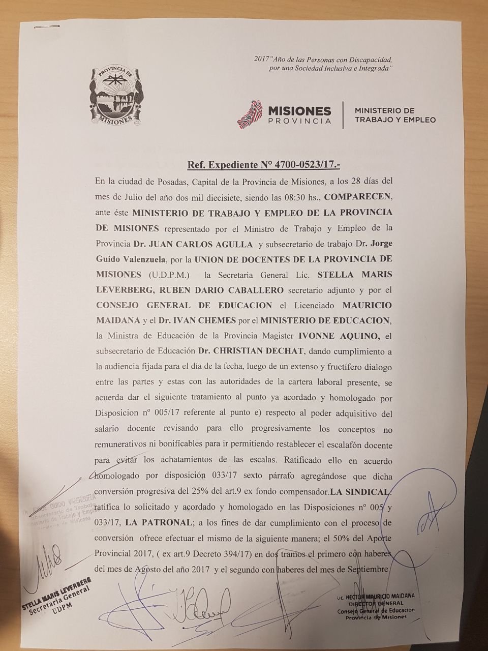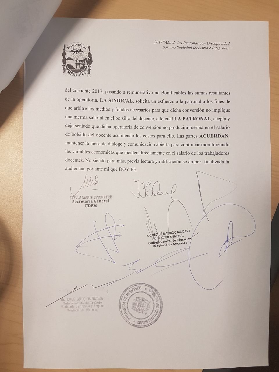El acuerdo firmado en la mañana de este viernes dice que: “en la audiencia fijada con las autoridades del Ministerio de Trabajo, Educación y Hacienda de la provincia se acuerda dar tratamiento al punto acordado y homologado por las disposiciones número 005/17 (referente al punto donde establece el compromiso de avanzar en mejorar el poder adquisitivo del salario docente, revisando para ello progresivamente los conceptos no remunerativos ni bonificables para ir permitiendo restablecer el escalafón docente y evitar los achatamientos de las escalas); y vuelto a ratificar en el acuerdo homologado por la disposición 033/17 del sexto párrafo.