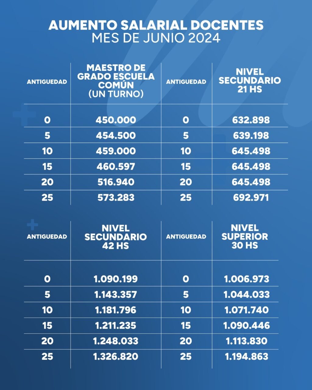 Los gremios docentes participantes llegaron a un acuerdo y según el acta que se firmó se elevará el salario inicial para el mes de junio a $450.000, quedando por fuera del mismo la zona. A su vez se actualizará el Código 960, correspondiente a la movilidad, quedando en $1079 por litro de nafta súper.