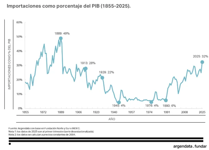Las importaciones alcanzan su mayor peso sobre el PBI en 135 años. En el primer trimestre de 2025, representaron el 32% del Producto Bruto Interno. El récord responde a la apertura comercial, atraso cambiario y una recuperación del consumo