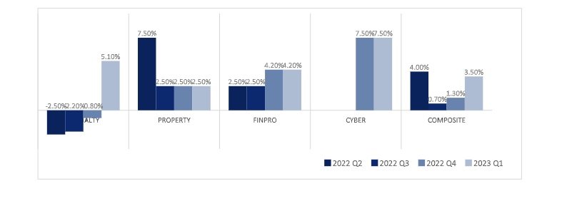 Los aumentos de precios de las líneas financieras y profesionales se moderaron significativamente, aumentando un 1%, en comparación con el 8% del trimestre anterior. - D&O y responsabilidad profesional continuaron viendo precios competitivos a medida que ingresaba nueva capacidad al mercado.