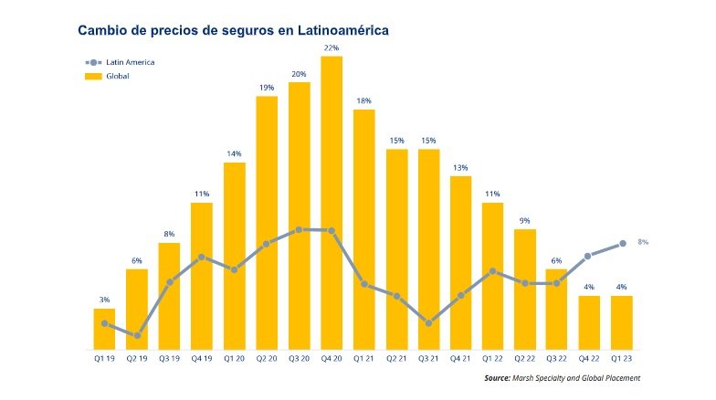 Los precios de los seguros comerciales en América latina aumentaron un 8% en el primer trimestre de 2023, contra el 7% del cuarto trimestre de 2022, es decir tres puntos adicionales del 4% registrado a nivel global, según el Índice del Mercado de Seguros Globales publicado hoy por Marsh, el corredor de seguros y asesor de riesgos líder en el mundo y una empresa de Marsh McLennan. Vale la pena destacar que este primer trimestre de 2023 marca el vigésimo segundo trimestre consecutivo de aumentos de precios.