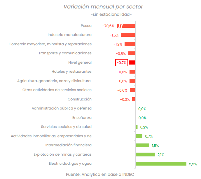 De los 16 sectores relevados, 7 registraron variaciones positivas, con destaque en electricidad, gas y agua (+5,5%), explotación de minas y canteras (+2,1%) e intermediación financiera (+1,5%).