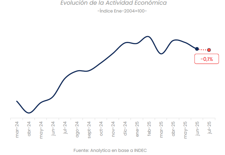 La dinámica refuerza la tendencia de la primera mitad del año: de los siete meses de 2025, en cinco la actividad tuvo variaciones negativas, dejando a la economía 0,8% por debajo del nivel de diciembre de 2024.