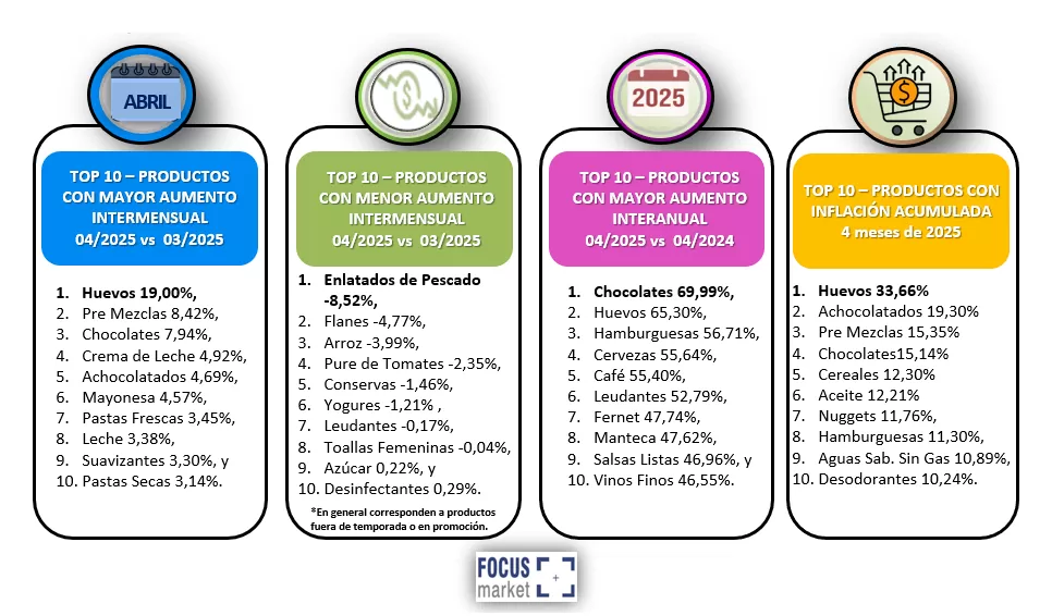 En el top 10 de los productos que más aumentaron en Abril 2025 se encuentran: 1.Huevos 19,00%, 2.Pre Mezclas 8,42%, 3.Chocolates 7,94%, 4.Crema de Leche 4,92%, 5.Achocolatados 4,69%, 6.Mayonesa 4,57%, 7.Pastas Frescas 3,45%, 8.Leche 3,38%, 9.Suavizantes 3,30%, y Pastas Secas 3,14%.