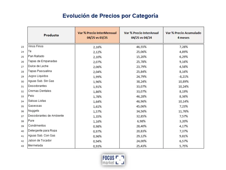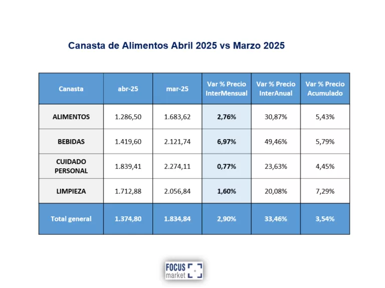 Desde la consultora Focus Market vía Scanntech (lector de código de barra en 970 puntos de venta en todo el país) seleccionaron un conjunto de 67 skus que engloban a 682 productos, formados por el precio promedio ponderado de todas las categorías, todas las marcas, y todas las presentaciones, de los productos más consumidos por los argentinos. Esto a los efectos de evaluar la evolución anual de precios de Abril 2025 vs Abril 2024 y la variación porcentual de precios del mes de Abril 2025 respecto de Marzo 2025.