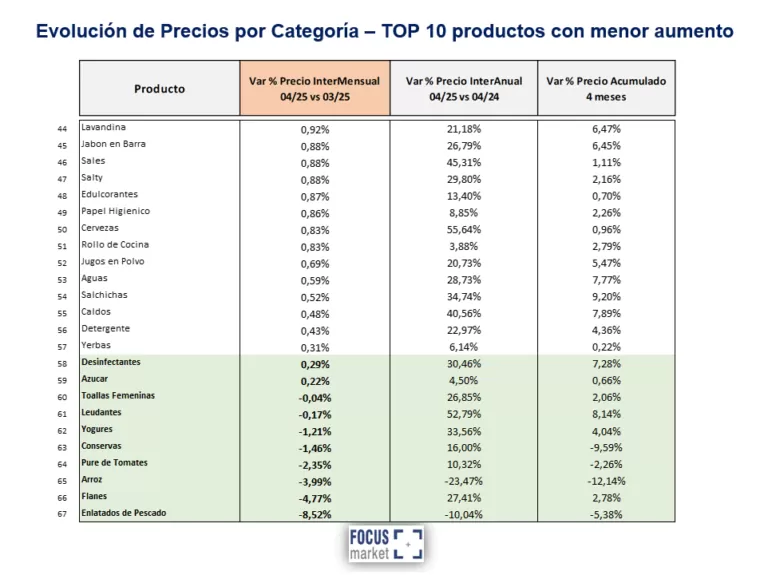 El dato destacado de este informe es la baja de los siguientes productos que en general corresponden a productos fuera de temporada o en promoción: 1.Enlatados de Pescado -8,52%, 2.Flanes -4,77%, 3.Arroz -3,99%, 4.Pure de Tomates -2,35%, 5.Conservas -1,46%, 6.Yogures -1,21% , 7.Leudantes -0,17%, 8.Toallas Femeninas -0,04%, 9.Azúcar 0,22%, y 10.Desinfectantes 0,29%.