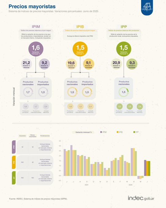 El Índice de Precios Internos al por Mayor (IPIM) aumentó un 1,6% en junio de 2025 respecto del mes anterior, según datos publicados por el Instituto Nacional de Estadística y Censos (INDEC). Esta variación fue impulsada principalmente por un alza de 1,7% en los productos nacionales y de 1,3% en los importados.