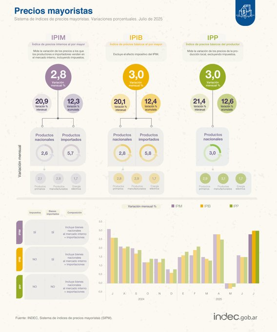 El Instituto Nacional de Estadística y Censos (INDEC) informó que el Índice de Precios Internos al por Mayor (IPIM) aumentó 2,8% en julio de 2025, impulsado por un alza del 5,7% en los productos importados y del 2,6% en los bienes de origen nacional. La variación interanual alcanzó el 20,9%, mientras que el acumulado de los primeros siete meses del año se ubicó en 12,3%.