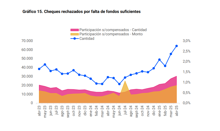 Más grave es la cantidad de cheques rechazados que subió en abril casi al 3% y representa la mayor cantidad en los últimos 5 años, para lo cual hay que remontarse a la prepandemia. En total, superaron los 64.000 en términos absolutos, con una tasa de rechazo del 1,3 % respecto al total de cheques compensados.