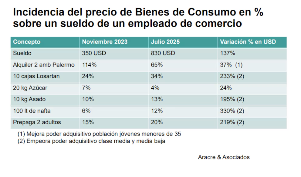 Un informe de Aracre y Asociados revela que, pese a una mejora relativa del salario medido en dólares frente a alquileres y bienes durables desde fines de 2023, el encarecimiento de alimentos, combustibles y servicios de salud golpea a la clase media y baja. El fenómeno explica el respaldo juvenil al programa económico, mientras que la composición del consumo se reconfigura.