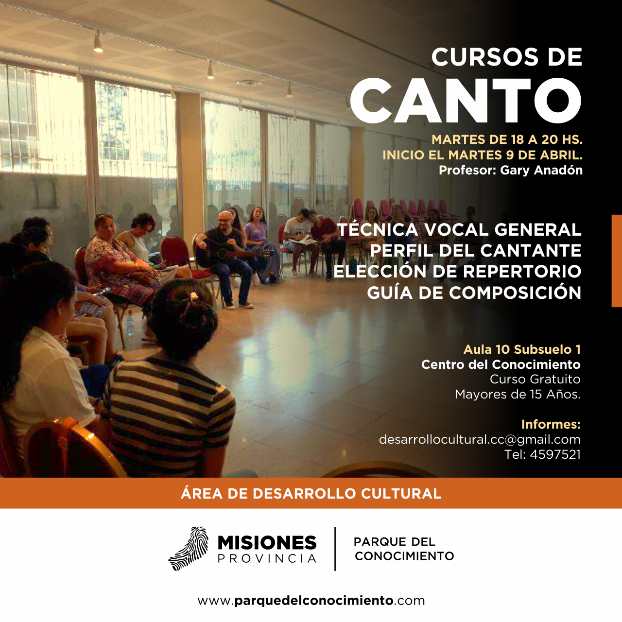 Los talleres de Canto comenzarán a dictarse a partir del 9 de abril, los martes de 18 a 20 Hs. en el subsuelo 1, aula 10 del Parque del Conocimiento. El curso está destinado a jóvenes desde los 15 años sin límite de edad, con o sin formación previa. Actividad libre y gratuita.