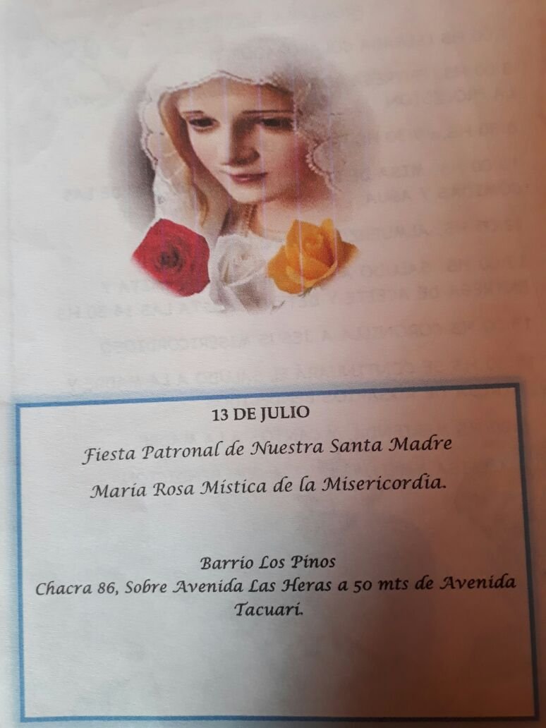 Los vecinos y fieles de Posadas celebrarán el día de la Rosa Mística en la ermita ubicada en el barrio Los Pinos (en la esquina de las avenidas Tacuarí y las Heras). Las actividades comenzarán este miércoles desde las 22 con la primera oración y una vigilia, mañana habrá actividades todo el día.