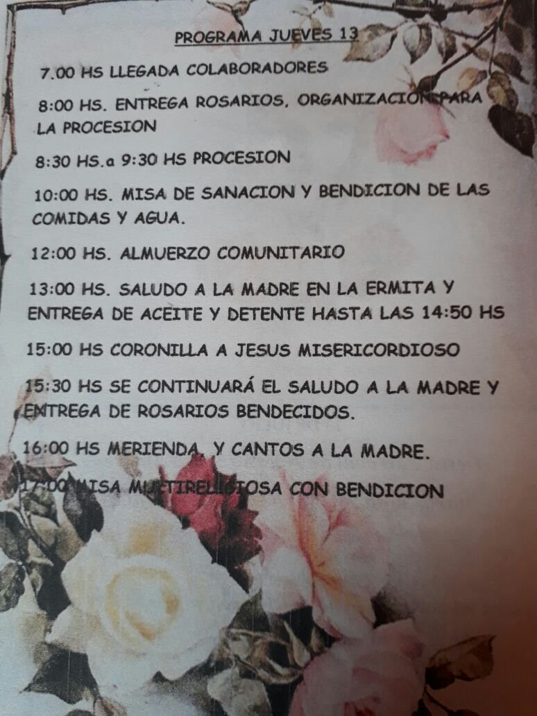 Las actividades en el barrio los pinos comenzarán desde las 8 de la mañana con una procesión de la imagen por la zona, luego habrá misa de sanación y luego almuerzo comunitario. Por la tarde seguirán las actividades hasta las 17 horas que habrá una misa interreligiosa.