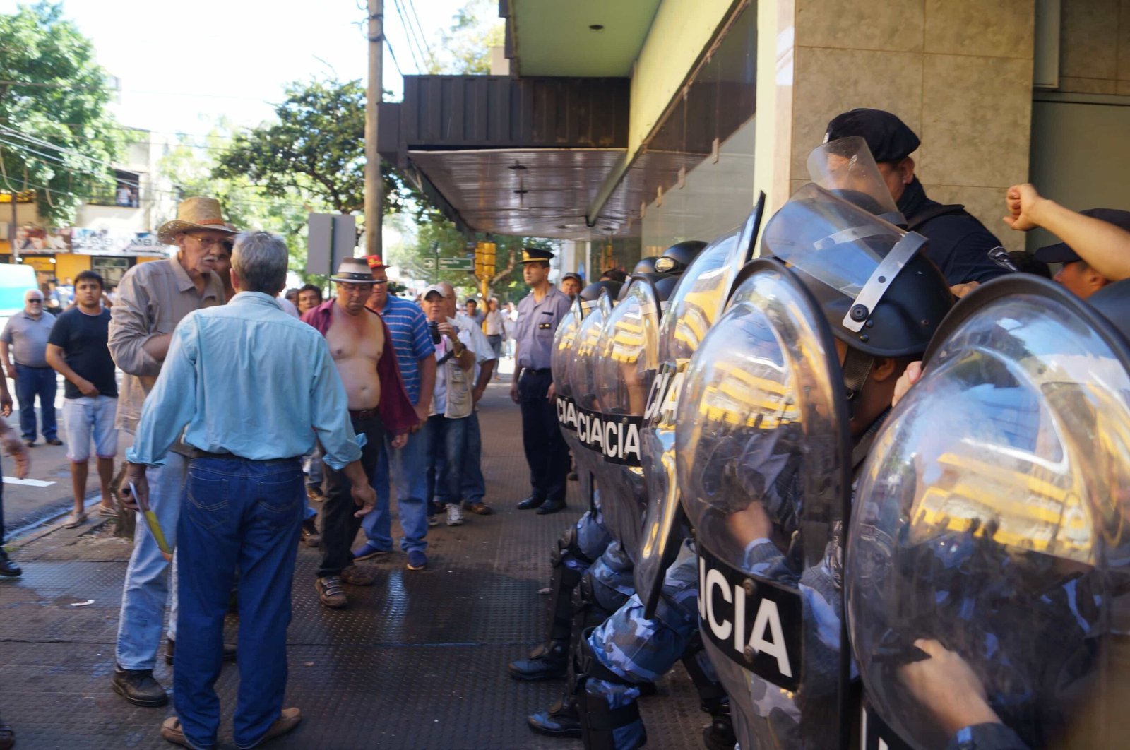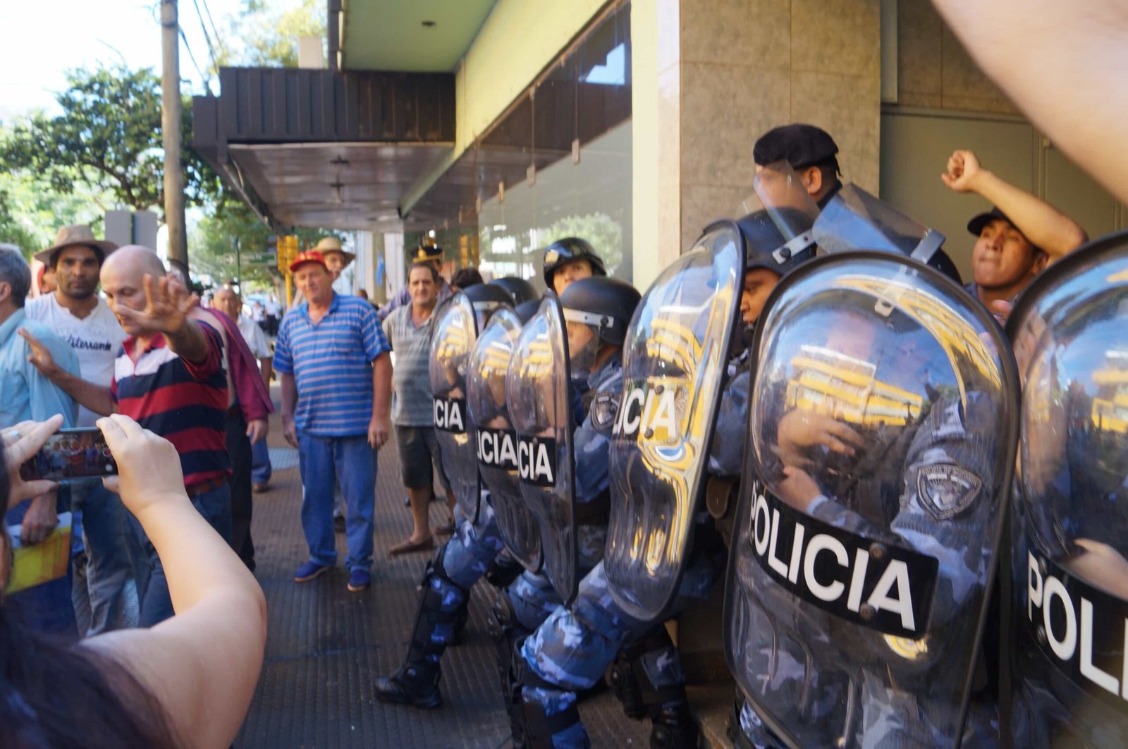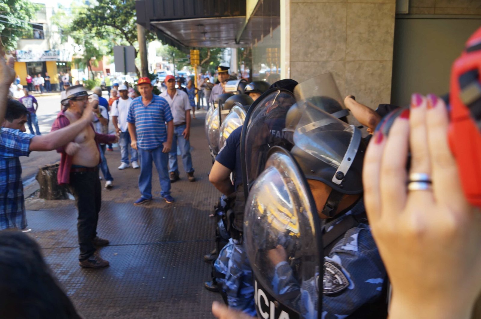 Al bloquear la puerta de acceso al edificio el personal policial comenzó a golpear con los escudos a los manifestantes, lo cual derivó en un tumulto en el que no faltaron piedras y palos volando, hasta un escopetazo al aire de parte del personal de seguridad. Ante este tumulto Julio Peterson el vocero de los manifestantes se acercó al balcón del tercer piso y comenzó a pedir a los gritos que los manifestantes se contengan.