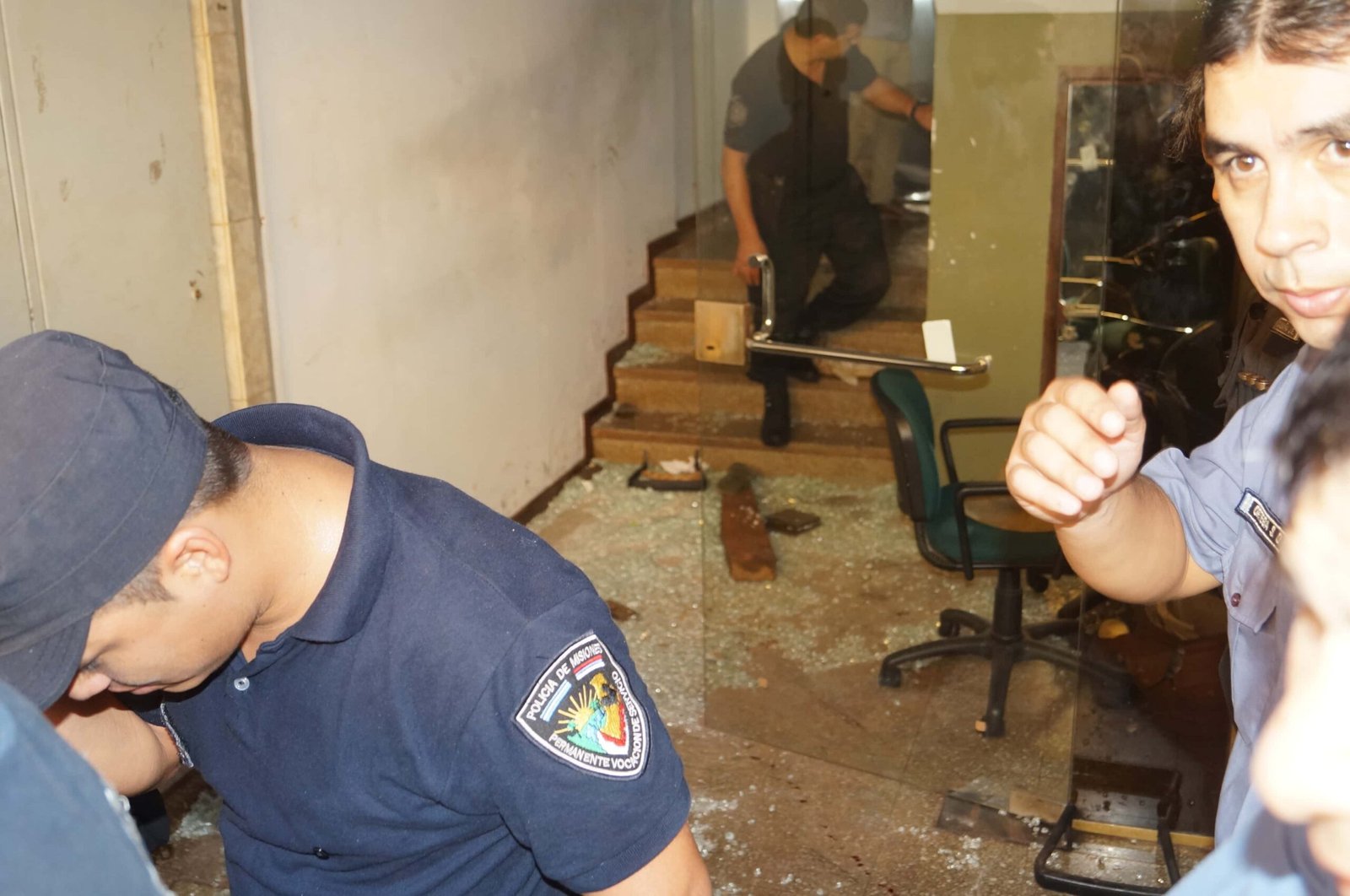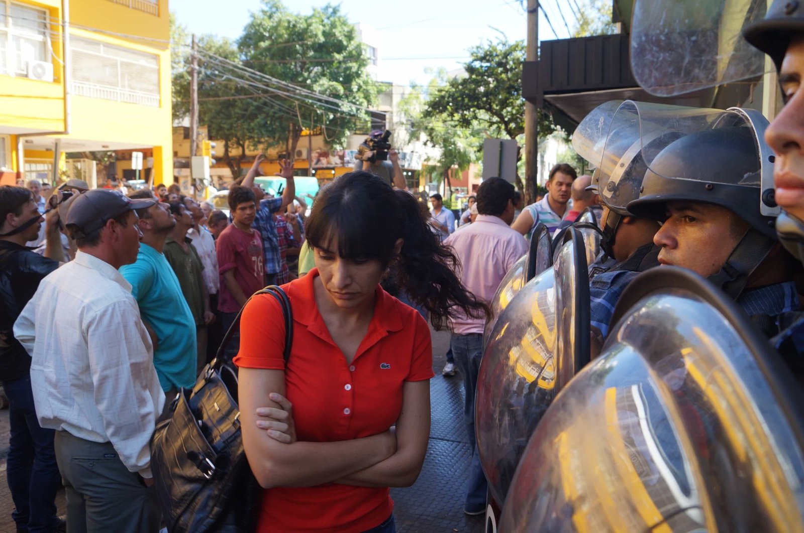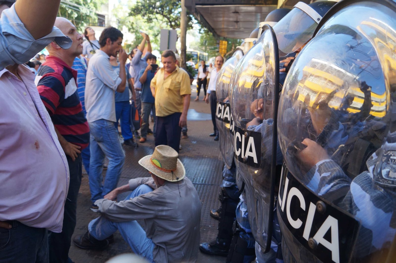 Al bloquear la puerta de acceso al edificio el personal policial comenzó a golpear con los escudos a los manifestantes, lo cual derivó en un tumulto en el que no faltaron piedras y palos volando, hasta un escopetazo al aire de parte del personal de seguridad. Ante este tumulto Julio Peterson el vocero de los manifestantes se acercó al balcón del tercer piso y comenzó a pedir a los gritos que los manifestantes se contengan.