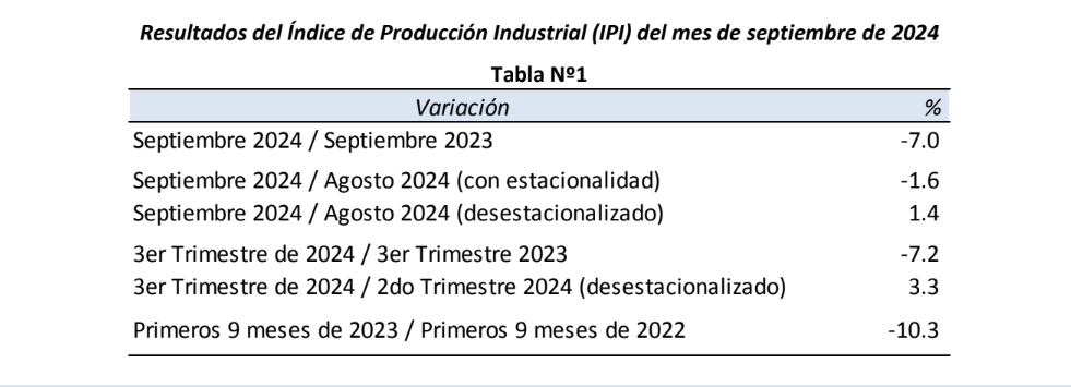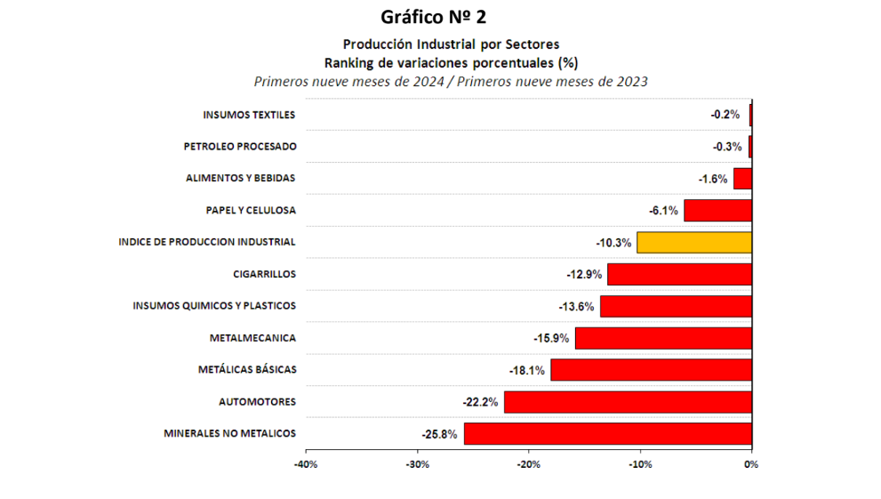 En los primeros nueve meses de 2024 y en la comparación con el período enero septiembre del año pasado la industria acumula una caída de 10.3%. En el nonestre, la rama de los minerales no metálicos continúa liderando la contracción de la actividad con una caída acumulada de 25.8%, seguida de la producción automotriz que registra un retroceso del 22.2%. También muestran una contracción superior al promedio las industrias metálicas básicas (18.1%), la metalmecánica (-15.9%), la producción de insumos químicos y plásticos (13.6%) y los despachos de cigarrillos (12.9%), en cada caso en los primeros nueve meses y en la comparación con el mismo período del año pasado. Con una contracción menor que el promedio se coloca la producción de papel y celulosa con una merma del 6.1% seguida de la de alimentos y bebidas que acumula una caída del 1.6%, en ambos casos en el período enero septiembre y en la comparación con los primeros nueve meses de 2023.