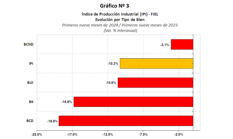 Desde la perspectiva de los tipos de bienes producidos, todos muestran una caída en los primeros nueve meses del año en la comparación con el mismo período de 2023. Con la excepción de la producción de bienes durables, que registra la mayor contracción acumulada y que alcanza 18.9%, los restantes tipos de bienes tienen una reducción en la dinámica de la caída. En el caso de la producción de bienes de consumo durable el retroceso de la producción acumulada en el nonestre es de 16.8%, los bienes de uso intermedio registran una merma de 10.6%, mientras que los bienes de consumo no durable muestran una reducción de 3.1%, en cada caso entre enero y septiembre en la comparación con el mismo período del año pasado. Los bienes de uso intermedio continúan realizando el mayor aporte a la contracción de la industria (Véase Gráficos No 3).