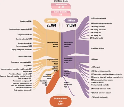 En paralelo, el ingreso primario (intereses, dividendos y pagos de inversiones) registró un déficit de USD 3.333 millones, mejorando levemente respecto al mismo período de 2024 gracias a una caída de las utilidades remitidas al exterior. La cuenta ingreso secundario (remesas, impuestos y transferencias) aportó un modesto superávit de USD 584 millones.