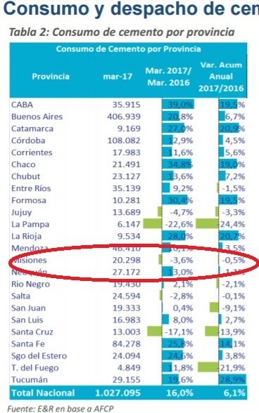 El dato más elocuente para ilustrar esta situación es el de despachos de cemento, que crecieron en marzo un 15,9% en todo el país, pero en Misiones cayeron 3,6%. Solo tres provincias estuvieron peor en este rubro: La Pampa, Jujuy, Santa Cruz y Salta.