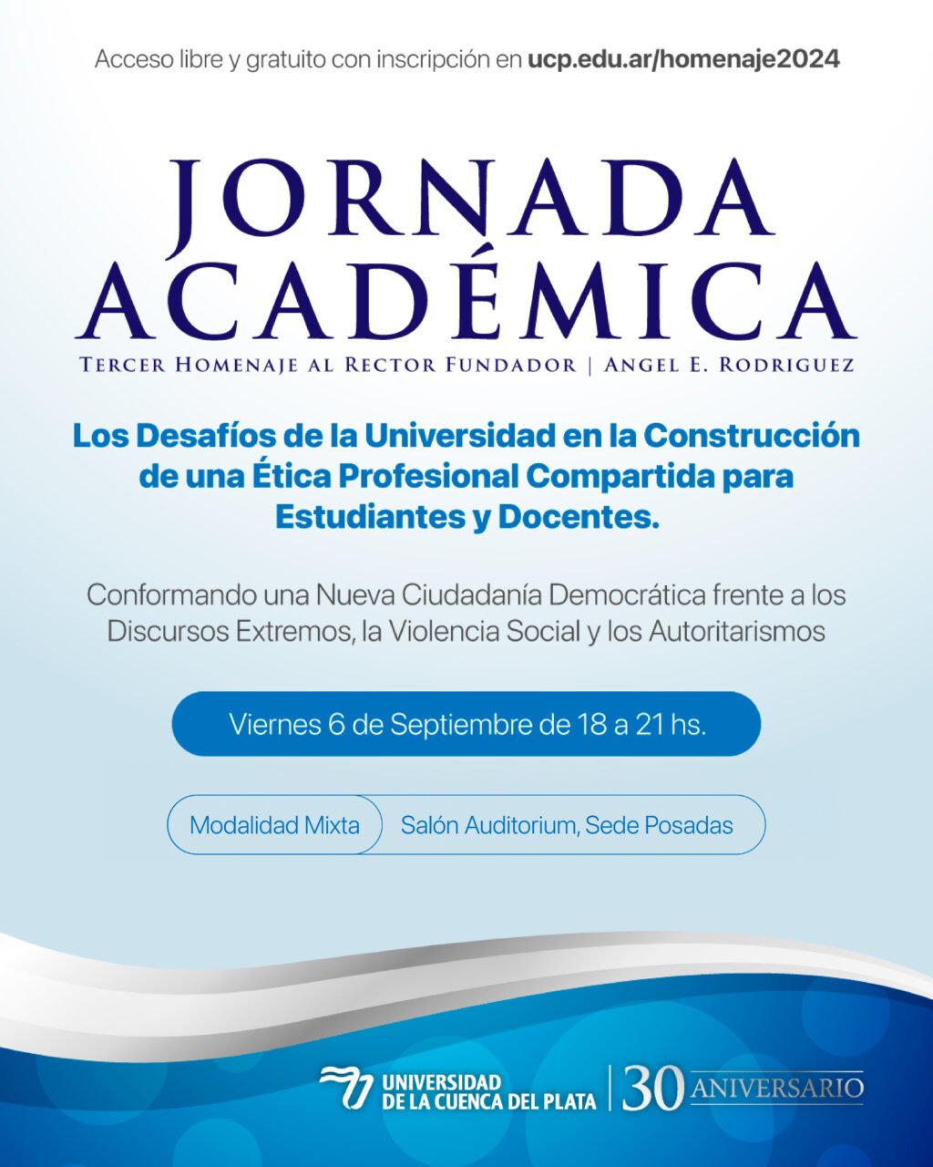 La Universidad de la Cuenca del Plata invita a toda la comunidad a participar de la Jornada Académica titulada “Los Desafíos de la Universidad en la Construcción de una Ética Profesional”. Este evento se llevará a cabo el próximo viernes 6 de septiembre a partir de las 18:00hs, en modalidad mixta: presencial en el auditorio de la sede Posadas (Barrufaldi 2364), y virtual a través de plataformas digitales para las sedes y delegaciones regionales.