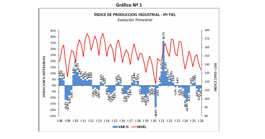El índice de producción industrial de FIEL mostró en marzo una leve suba interanual de 0,6%, tras ocho meses de retroceso, aunque el primer trimestre cerró con una baja de 2,3%