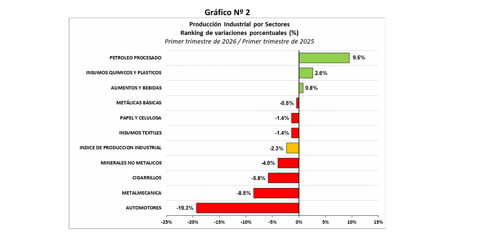 En cuanto al desempeño de los sectores en el primer trimestre y en la comparación interanual, el ranking de crecimiento lo lidera la refinación de petróleo con una mejora acumulada de 9.5%, seguida de la producción de químicos y plásticos con un alza de 2.6%, y de los alimentos y bebidas con un ligero avance de 0.8%. Con un retroceso inferior al promedio de la industria se colocan las industrias metálicas básicas (‐0.5%) y la producción de papel y celulosa y de insumos textiles con una caída de 1.4% en cada caso en la comparación con el nivel de actividad del primer trimestre del año pasado. Con una contracción superior al promedio de la industria se ubica la producción de minerales no metálicos que acumula una caída de 4%, seguida de los despachos de cigarrillos con una merma del 5.8%, de la producción metalmecánica con un retroceso de 8.5%, y de la producción automotriz con un descenso de 19.3%, en cada caso en la comparación con el nivel de actividad de enero marzo de 2025 (véase Gráfico Nº 2). Con lo anterior, en el trimestre el mayor aporte para amortiguar la caída de la industria lo realiza la refinación de petróleo, al tiempo que cerca del 70% de la caída acumulada lo realizó la industria automotriz.