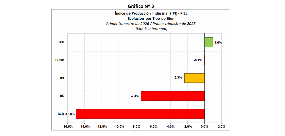 Desde la perspectiva de los tipos de bienes producidos, en el primer trimestre y en la comparación interanual, los bienes de uso intermedio pasaron a acumular una mejora del 1% a partir del aporte de la refinación de petróleo y el rebote en la producción de químicos y plásticos. Los bienes de consumo no durable igualan en el trimestre el nivel de actividad alcanzado el mismo periodo del año pasado, mientras que con una caída más profunda que el promedio de la industria se ubican los bienes de capital que acumulan en los primeros tres meses del año un retroceso de 7.4%. Finalmente, los bienes de consumo durable con una contracción acumulada del 15% entre enero y marzo, hacen el mayor aporte a la caída de la industria en los primeros tres meses del año (véase Gráficos Nº 3).